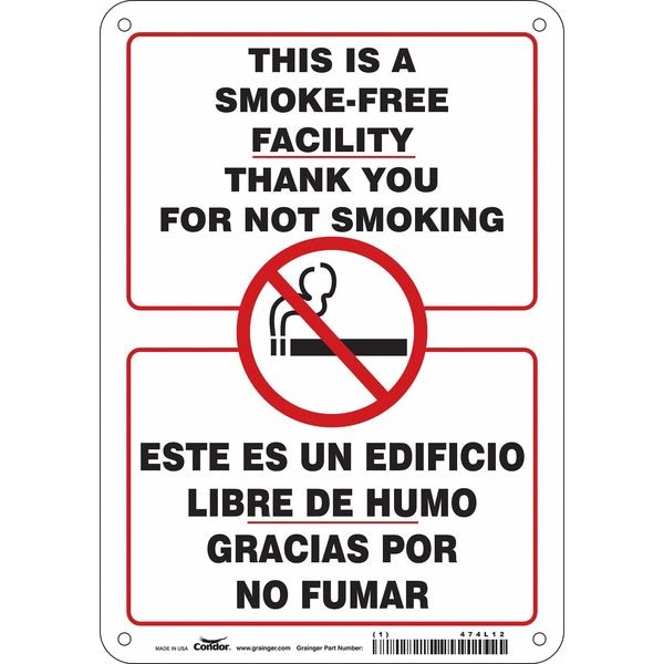 Safety Sign, Horizontal Rectangle, Number of Printed Sides 1, English, Spanish, Sign Format Other Format, Sign Legend This Is A Smoke- Free Facility Thank You For Not Smoking/Este Es Un Edificio Libre De Humo Gracias Por No Fumar, Sign Legend Background Color White, Sign Legend Style Symbol and Text