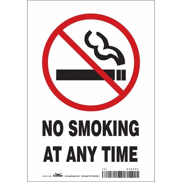 Safety Sign, Horizontal Rectangle, Number of Printed Sides 1, English, Sign Format Other Format, Sign Legend No Smoking At Any Time, Sign Legend Background Color White, Sign Legend Style Symbol and Text