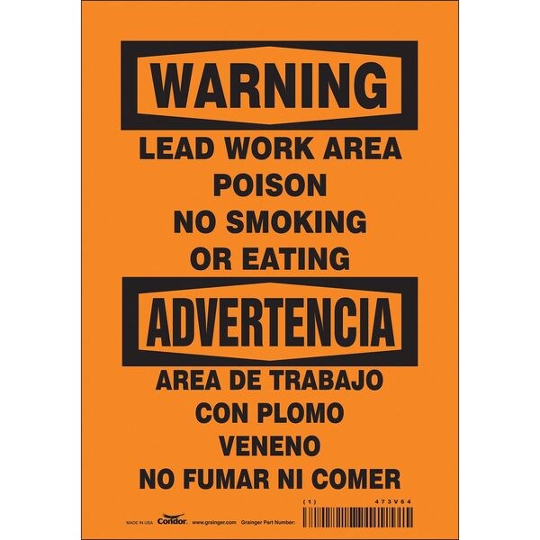 Safety Sign, Horizontal Rectangle, Number of Printed Sides 1, English, Spanish, Sign Format Traditional OSHA, Sign Legend Lead Work Area Poison No Smoking Or Eating/Area De Trabajo Con Plomo Veneno No Fumar Ni Comer, Sign Legend Background Color Orange, Sign Legend Style Text