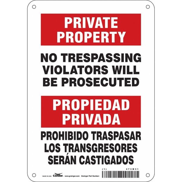 Safety Sign, Horizontal Rectangle, Number of Printed Sides 1, English, Spanish, Sign Format Other Format, Sign Legend No Trespassing Violators Will Be Prosecuted/Propiedad Privada Prohibido Traspasar Los Transgresores Seran Castigados, Sign Legend Background Color Red, White, Sign Legend Style Text