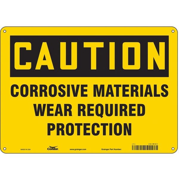 Safety Sign, Horizontal Rectangle, Number of Printed Sides 1, English, Sign Format Traditional OSHA, Sign Legend Corrosive Materials Wear Required Protection, Sign Legend Background Color Yellow, Sign Legend Style Text