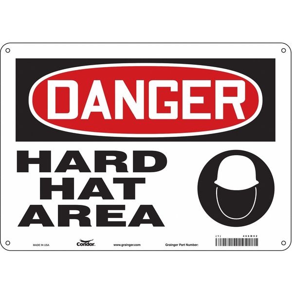 Safety Sign, Horizontal Rectangle, Number of Printed Sides 1, English, Sign Format Traditional OSHA, Sign Legend Hard Hat Area, Sign Legend Background Color White, Sign Legend Style Symbol and Text
