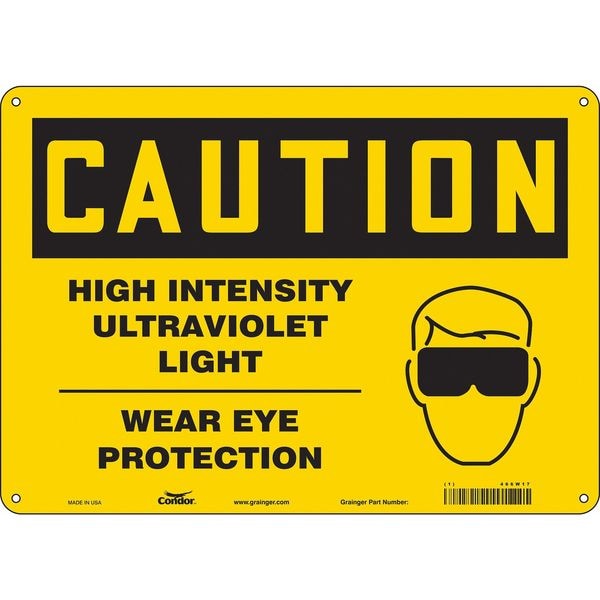 Safety Sign, Horizontal Rectangle, Number of Printed Sides 1, English, Sign Format Traditional OSHA, Sign Legend High Intensity Ultraviolet Light Wear Eye Protection, Sign Legend Background Color Yellow, Sign Legend Style Symbol and Text