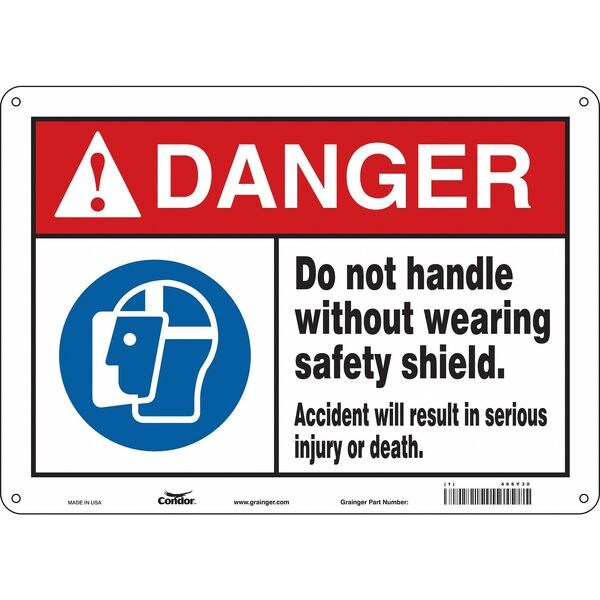Safety Sign, Horizontal Rectangle, Number of Printed Sides 1, English, Sign Format ANSI/OSHA Format, Sign Legend Do Not Handle Without Wearing Safety Shield. Accident Will Result In Serious Injury Or Death, Sign Legend Background Color White, Sign Legend Style Symbol and Text