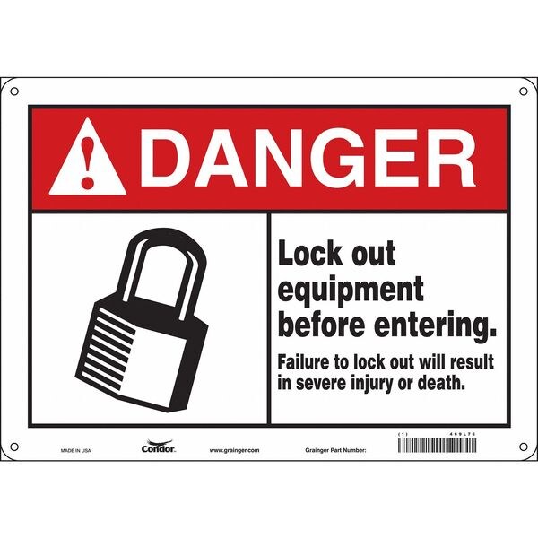 Safety Sign, Horizontal Rectangle, Number of Printed Sides 1, English, Sign Format ANSI/OSHA Format, Sign Legend Lock Out Equipment Before Entering. Failure To Lock Out Will Result In Severe Injury Or Death., Sign Legend Background Color White, Sign Legend Style Symbol and Text