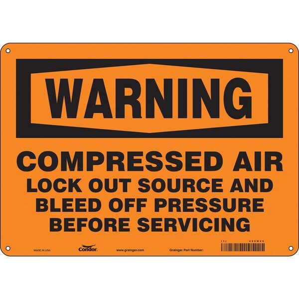 Safety Sign, Horizontal Rectangle, Number of Printed Sides 1, English, Sign Format Traditional OSHA, Sign Legend Compressed Air Lock Out Source And Bleed Off Pressure Before Servicing, Sign Legend Background Color Orange, Sign Legend Style Text