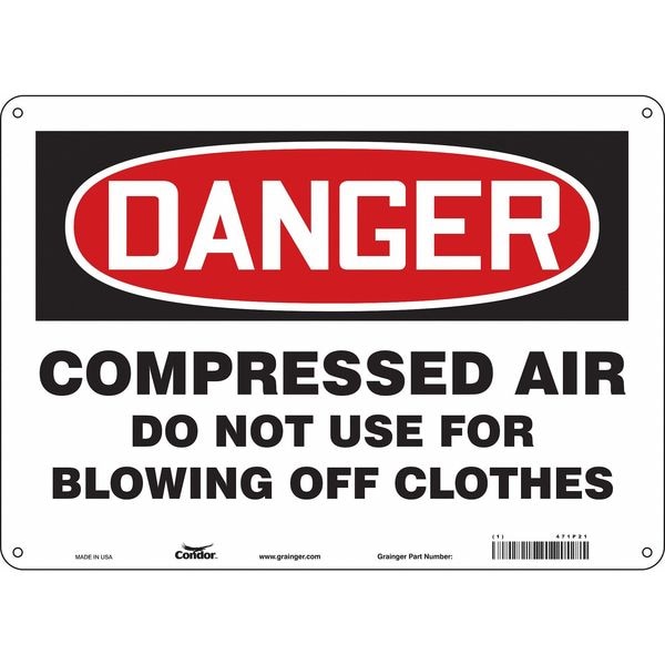 Safety Sign, Horizontal Rectangle, Number of Printed Sides 1, English, Sign Format Traditional OSHA, Sign Legend Compressed Air Do Not Use For Blowing Off Clothes, Sign Legend Background Color White, Sign Legend Style Text