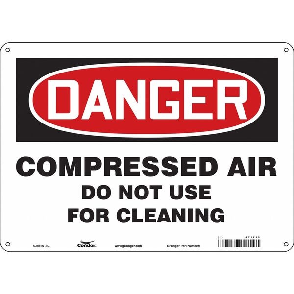 Safety Sign, Horizontal Rectangle, Number of Printed Sides 1, English, Sign Format Traditional OSHA, Sign Legend Compressed Air Do Not Use For Cleaning, Sign Legend Background Color White, Sign Legend Style Text