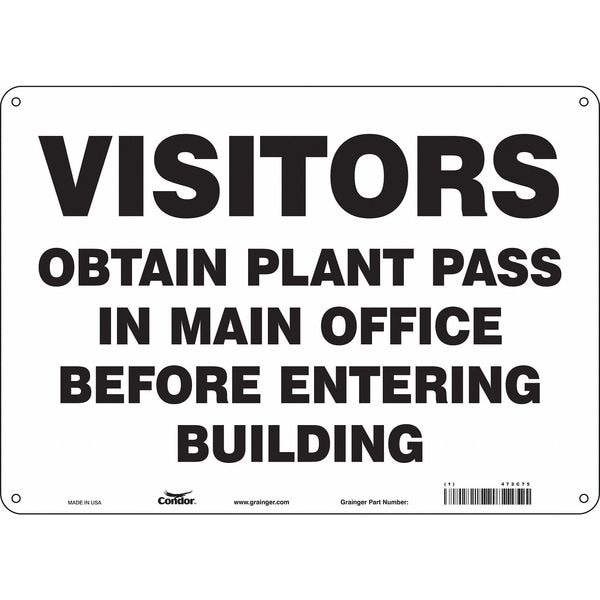 Safety Sign, Horizontal Rectangle, Number of Printed Sides 1, English, Sign Format Other Format, Sign Legend Visitors Obtain Plant Pass In Main Office Before Entering Building, Sign Legend Background Color White, Sign Legend Style Text