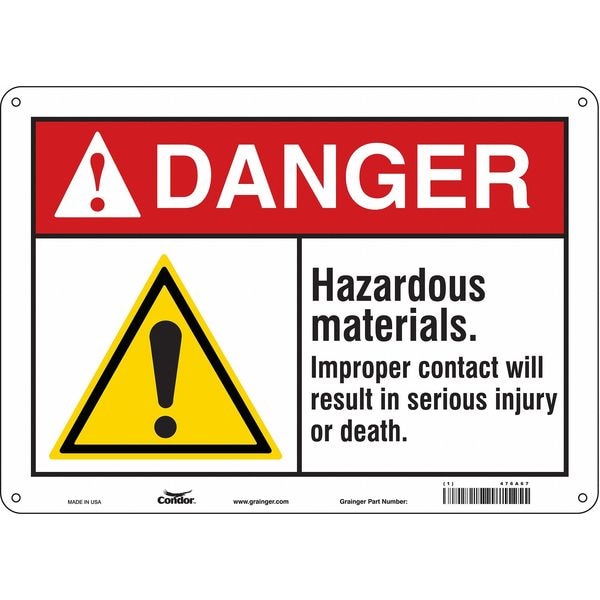 Safety Sign, Horizontal Rectangle, Number of Printed Sides 1, English, Sign Format ANSI/OSHA Format, Sign Legend Hazardous Materials. Improper Contact Will Result In Serious Injury Or Death., Sign Legend Background Color White, Sign Legend Style Symbol and Text