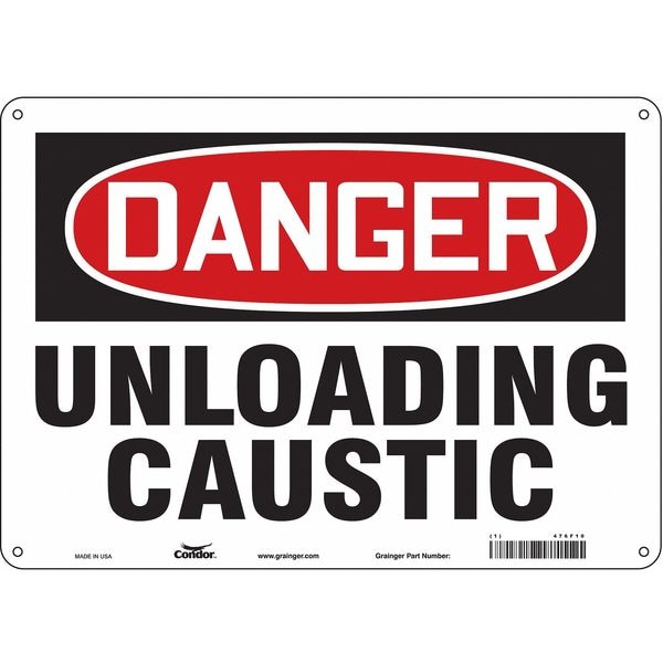 Safety Sign, Horizontal Rectangle, Number of Printed Sides 1, English, Sign Format Traditional OSHA, Sign Legend Unloading Caustic, Sign Legend Background Color White, Sign Legend Style Text