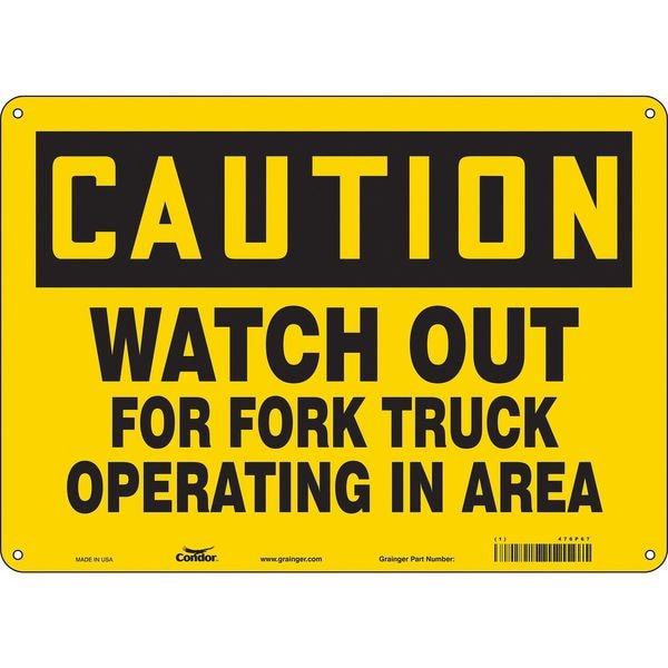 Safety Sign, Horizontal Rectangle, Number of Printed Sides 1, English, Sign Format Traditional OSHA, Sign Legend Watch Out For Fork Truck Operating In Area, Sign Legend Background Color Yellow, Sign Legend Style Text