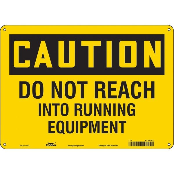 Safety Sign, Horizontal Rectangle, Number of Printed Sides 1, English, Sign Format Traditional OSHA, Sign Legend Do Not Reach Into Running Equipment, Sign Legend Background Color Yellow, Sign Legend Style Text