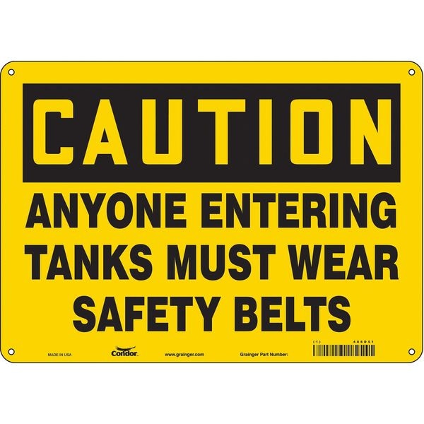 Safety Sign, Horizontal Rectangle, Number of Printed Sides 1, English, Sign Format Traditional OSHA, Sign Legend Anyone Entering Tanks Must Wear Safety Belts, Sign Legend Background Color Yellow, Sign Legend Style Text