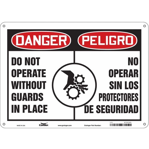 Safety Sign, Horizontal Rectangle, Number of Printed Sides 1, English, Spanish, Sign Format Traditional OSHA, Sign Legend Do Not Operate Without Guards In Place/No Operar Sin Los Protectores De Deguridad, Sign Legend Background Color White, Sign Legend Style Symbol and Text