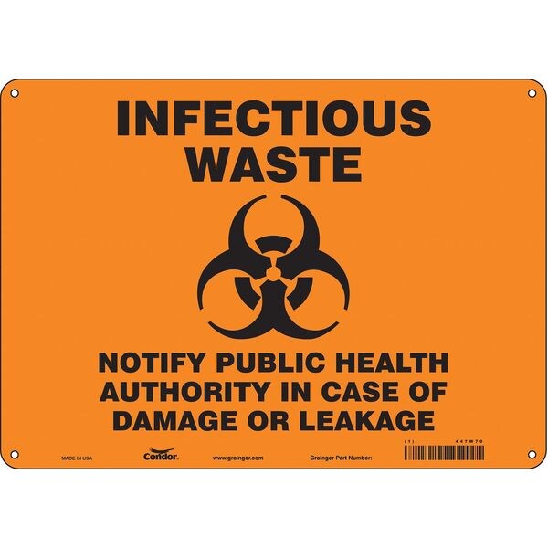 Safety Sign, Horizontal Rectangle, Number of Printed Sides 1, English, Sign Format Other Format, Sign Legend Infectious Waste Notify Public Health Authority In Case Of Damage Or Leakage, Sign Legend Background Color Orange, Sign Legend Style Symbol and Text
