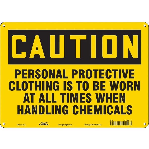 Safety Sign, Horizontal Rectangle, Number of Printed Sides 1, English, Sign Format Traditional OSHA, Sign Legend Personal Protective Clothing Is To Be Worn At All Times When Handling Chemicals, Sign Legend Background Color Yellow, Sign Legend Style Text