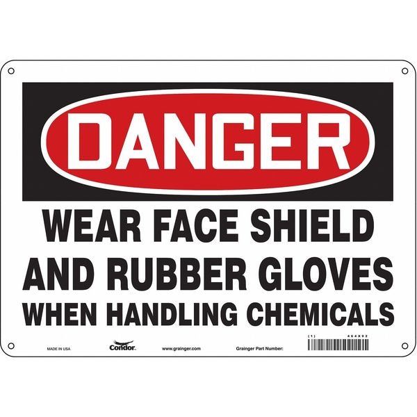 Safety Sign, Horizontal Rectangle, Number of Printed Sides 1, English, Sign Format Traditional OSHA, Sign Legend Wear Face Shield And Rubber Gloves When Handling Chemicals, Sign Legend Background Color White, Sign Legend Style Text