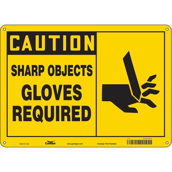 Safety Sign, Horizontal Rectangle, Number of Printed Sides 1, English, Sign Format Traditional OSHA, Sign Legend Sharp Objects Gloves Required, Sign Legend Background Color Yellow, Sign Legend Style Symbol and Text