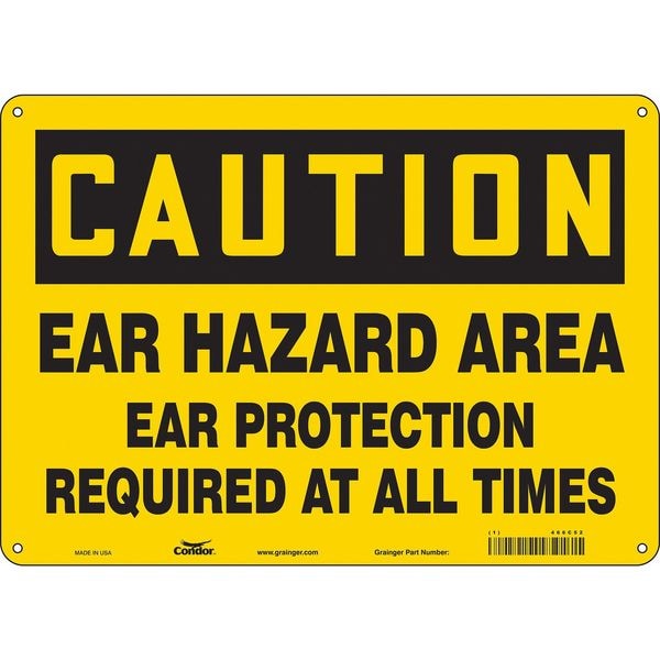 Safety Sign, Horizontal Rectangle, Number of Printed Sides 1, English, Sign Format Traditional OSHA, Sign Legend Ear Hazard Area Ear Protection Required At All Times, Sign Legend Background Color Yellow, Sign Legend Style Text