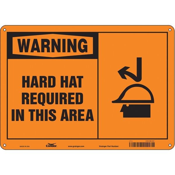 Safety Sign, Horizontal Rectangle, Number of Printed Sides 1, English, Sign Format Traditional OSHA, Sign Legend Hard Hat Required In This Area, Sign Legend Background Color Orange, Sign Legend Style Symbol and Text