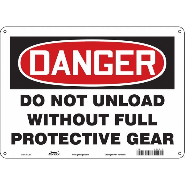 Safety Sign, Horizontal Rectangle, Number of Printed Sides 1, English, Sign Format Traditional OSHA, Sign Legend Do Not Unload Without Full Protective Gear, Sign Legend Background Color White, Sign Legend Style Text