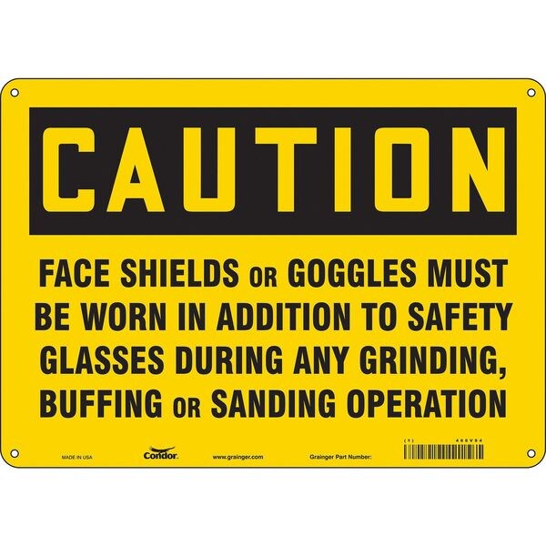 Safety Sign, Horizontal Rectangle, Number of Printed Sides 1, English, Sign Format Traditional OSHA, Sign Legend Face Shields Or Goggles Must Be Worn In Addition To Safety Glasses During Any Grinding, Buffing Or Sanding Operation, Sign Legend Background Color Yellow, Sign Legend Style Text