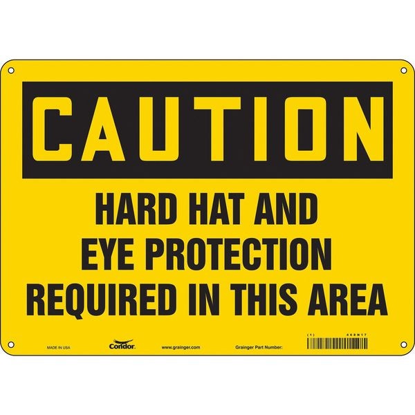 Safety Sign, Horizontal Rectangle, Number of Printed Sides 1, English, Sign Format Traditional OSHA, Sign Legend Hard Hat And Eye Protection Required In This Area, Sign Legend Background Color Yellow, Sign Legend Style Text