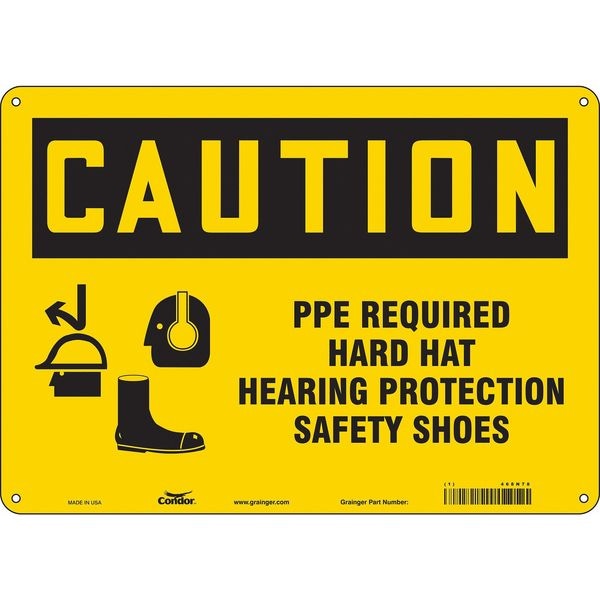 Safety Sign, Horizontal Rectangle, Number of Printed Sides 1, English, Sign Format Traditional OSHA, Sign Legend Ppe Required Hard Hat Hearing Protection Safety Shoes, Sign Legend Background Color Yellow, Sign Legend Style Symbol and Text