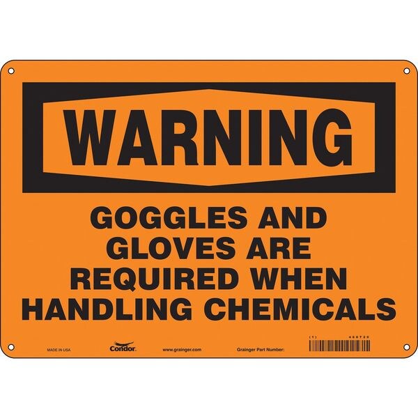 Safety Sign, Horizontal Rectangle, Number of Printed Sides 1, English, Sign Format Traditional OSHA, Sign Legend Goggles And Gloves Are Required When Handling Chemicals, Sign Legend Background Color Orange, Sign Legend Style Text