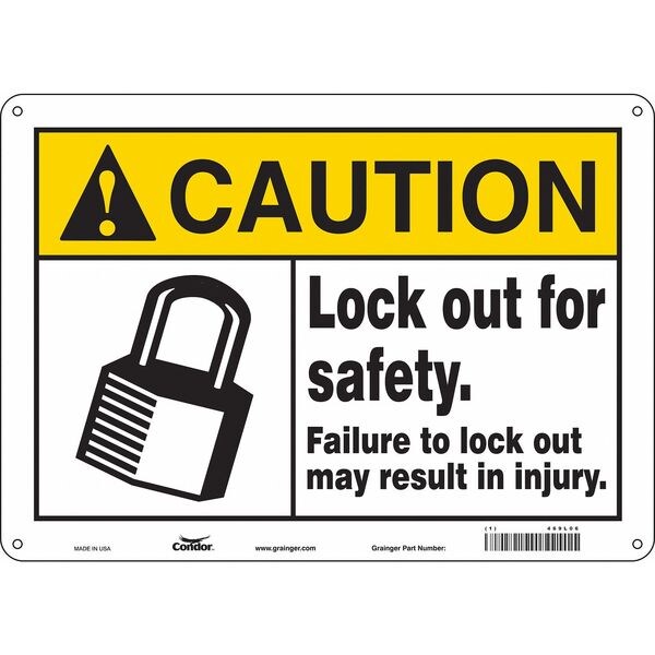 Safety Sign, Horizontal Rectangle, Number of Printed Sides 1, English, Sign Format Traditional OSHA, Sign Legend Lock Out For Safety. Failure To Lock Out May Result In Injury., Sign Legend Background Color Yellow, Sign Legend Style Symbol and Text