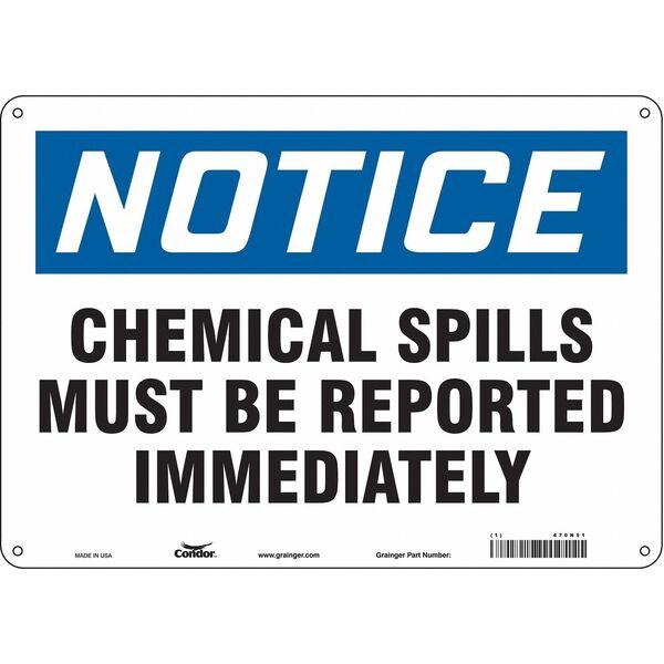 Safety Sign, Horizontal Rectangle, Number of Printed Sides 1, English, Sign Format Traditional OSHA, Sign Legend Chemical Spills Must Be Reported Immediately, Sign Legend Background Color White, Sign Legend Style Text