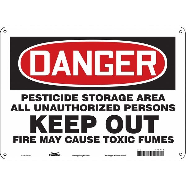 Safety Sign, Horizontal Rectangle, Number of Printed Sides 1, English, Sign Format Traditional OSHA, Sign Legend Pesticide Storage Area All Unauthorized Persons Keep Out Fire May Cause Toxic Fumes, Sign Legend Background Color White, Sign Legend Style Text