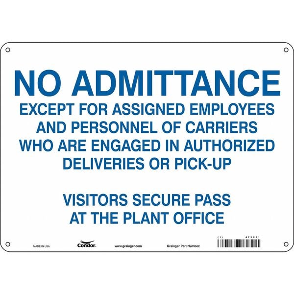 Safety Sign, Horizontal Rectangle, Number of Printed Sides 1, English, Sign Format Other Format, Sign Legend No Admittance Except For Assigned Employees And Personnel Of Carriers Who Are Engaged In Authorized Deliveries Or Pick-Up Visitors Secure Pass At The Plant Office, Sign Legend Background Color White, Sign Legend Style Text