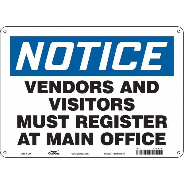 Safety Sign, Horizontal Rectangle, Number of Printed Sides 1, English, Sign Format Traditional OSHA, Sign Legend Vendors And Visitors Must Register At Main Office, Sign Legend Background Color White, Sign Legend Style Text