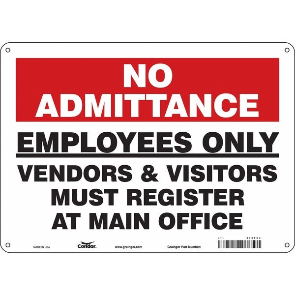 Safety Sign, Horizontal Rectangle, Number of Printed Sides 1, English, Sign Format Other Format, Sign Legend Employees Only Vendors & Visitors Must Register At Main Office, Sign Legend Background Color Red, White, Sign Legend Style Text
