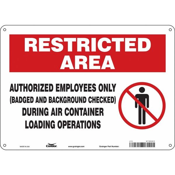 Safety Sign, Horizontal Rectangle, Number of Printed Sides 1, English, Sign Format Other Format, Sign Legend Authorized Employees Only (Badged And Background Checked) During Air Container Loading Operations, Sign Legend Background Color Red, White, Sign Legend Style Symbol and Text
