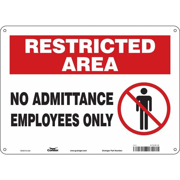 Safety Sign, Horizontal Rectangle, Number of Printed Sides 1, English, Sign Format Other Format, Sign Legend No Admittance Employees Only, Sign Legend Background Color Red, White, Sign Legend Style Symbol and Text