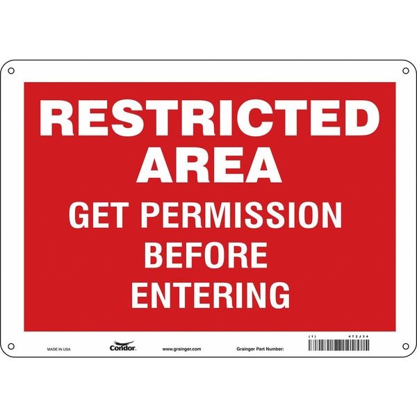 Safety Sign, Horizontal Rectangle, Number of Printed Sides 1, English, Sign Format Other Format, Sign Legend Restricted Area Get Permission Before Entering, Sign Legend Background Color Red, White, Sign Legend Style Text