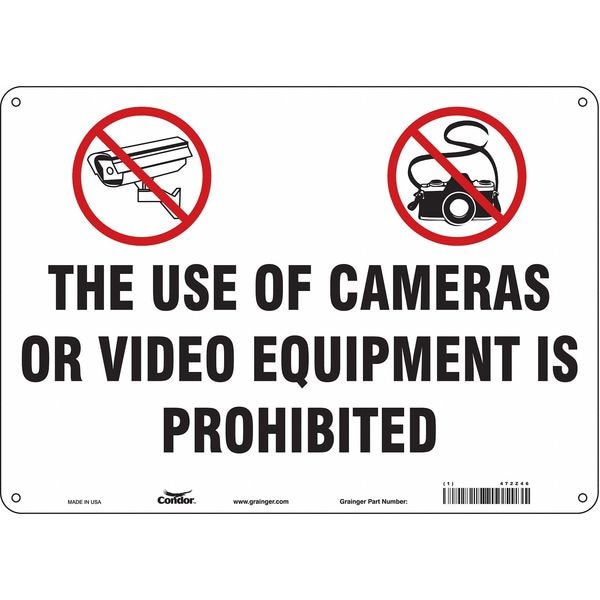 Safety Sign, Horizontal Rectangle, Number of Printed Sides 1, English, Sign Legend The Use Of Cameras Or Video Equipment Is Prohibited, Sign Legend Background Color White, Sign Legend Style Symbol and Text