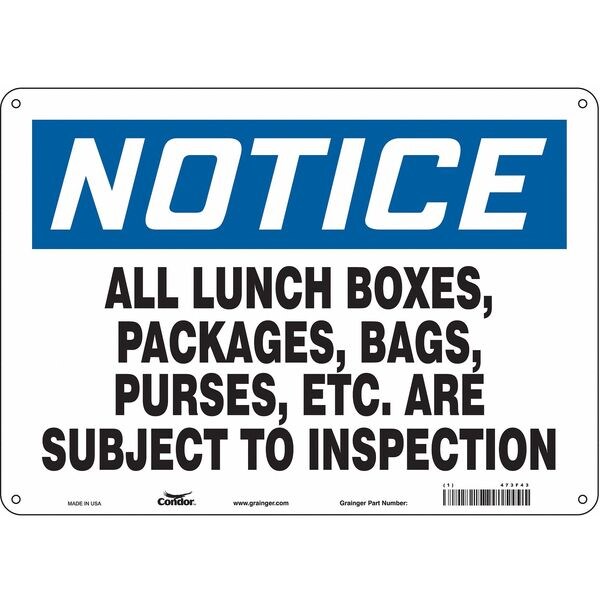 Safety Sign, Horizontal Rectangle, Number of Printed Sides 1, English, Sign Legend All Lunch Boxes, Packages, Bags, Purses, Etc. Are Subject To Inspection, Sign Legend Background Color White, Sign Legend Style Text