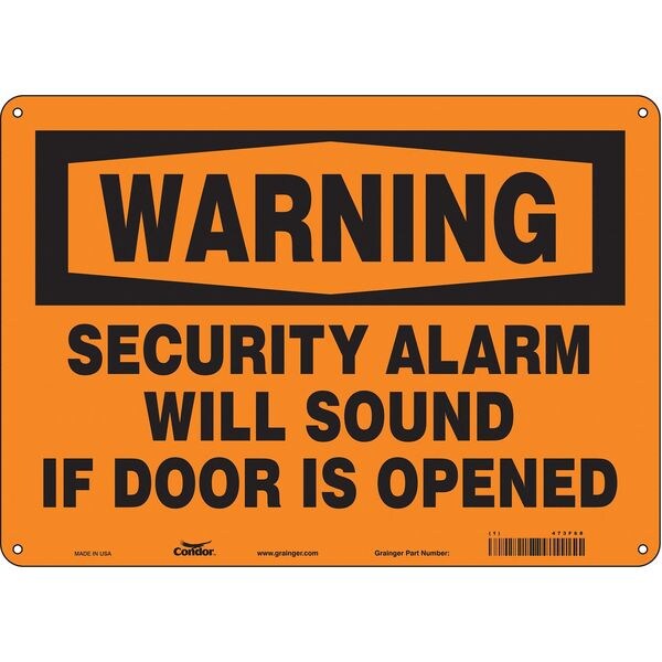 Safety Sign, Horizontal Rectangle, Number of Printed Sides 1, English, Sign Format Traditional OSHA, Sign Legend Security Alarm Will Sound If Door Is Opened, Sign Legend Background Color Orange, Sign Legend Style Text