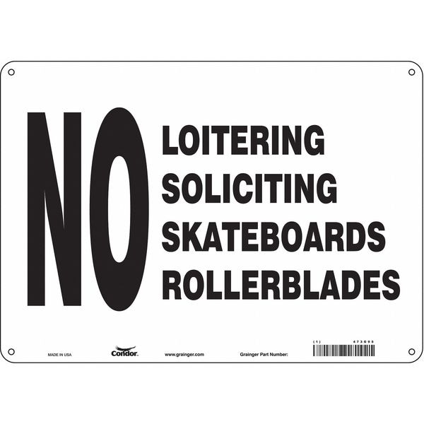 Safety Sign, Horizontal Rectangle, Number of Printed Sides 1, English, Sign Format Other Format, Sign Legend No Loitering Soliciting Skateboards Rollerblades, Sign Legend Background Color White, Sign Legend Style Text
