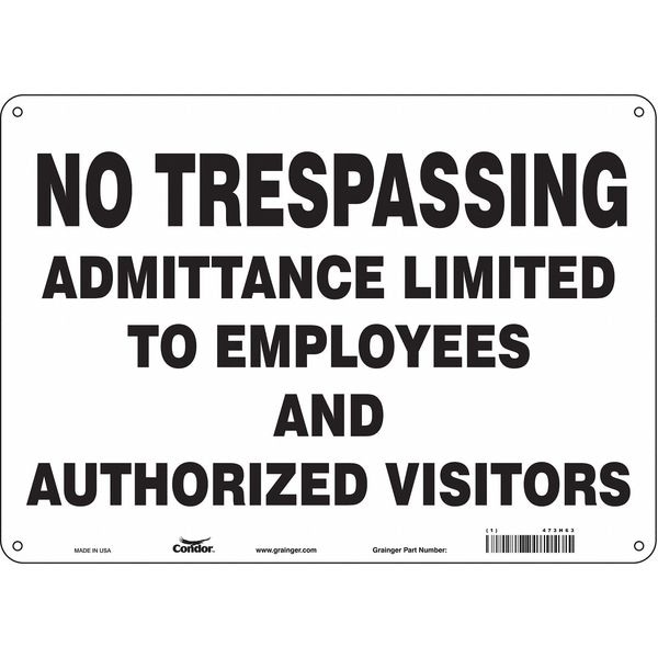 Safety Sign, Horizontal Rectangle, Number of Printed Sides 1, English, Sign Format Other Format, Sign Legend No Trespassing Admittance Limited To Employees And Authorized Visitors, Sign Legend Background Color White, Sign Legend Style Text