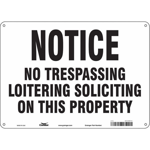 Safety Sign, Horizontal Rectangle, Number of Printed Sides 1, English, Sign Format Other Format, Sign Legend No Trespassing Loitering Soliciting On This Property, Sign Legend Background Color White, Sign Legend Style Text