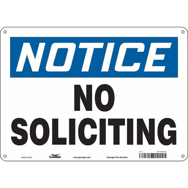 Safety Sign, Horizontal Rectangle, Number of Printed Sides 1, English, Sign Format Traditional OSHA, Sign Legend No Soliciting, Sign Legend Background Color White, Sign Legend Style Text