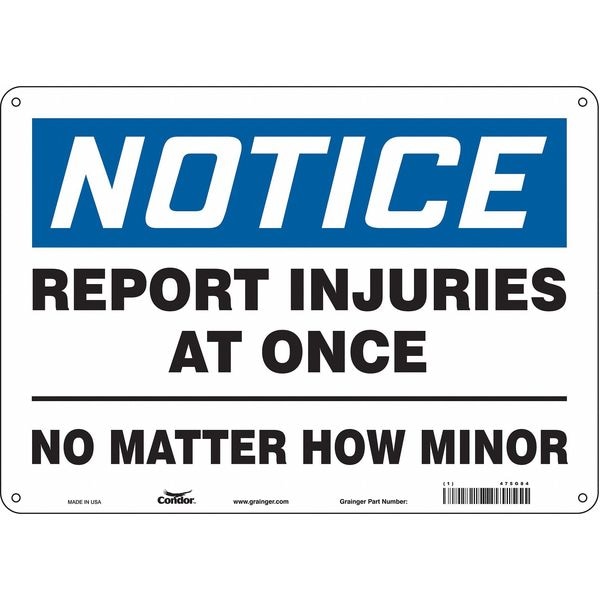 Safety Sign, Horizontal Rectangle, Number of Printed Sides 1, English, Sign Format Traditional OSHA, Sign Legend Report Injuries At Once No Matter How Minor, Sign Legend Background Color White, Sign Legend Style Text