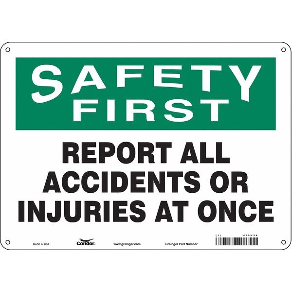 Safety Sign, Horizontal Rectangle, Number of Printed Sides 1, English, Sign Format Traditional OSHA, Sign Legend Report All Accidents Or Injuries At Once, Sign Legend Background Color White, Sign Legend Style Text