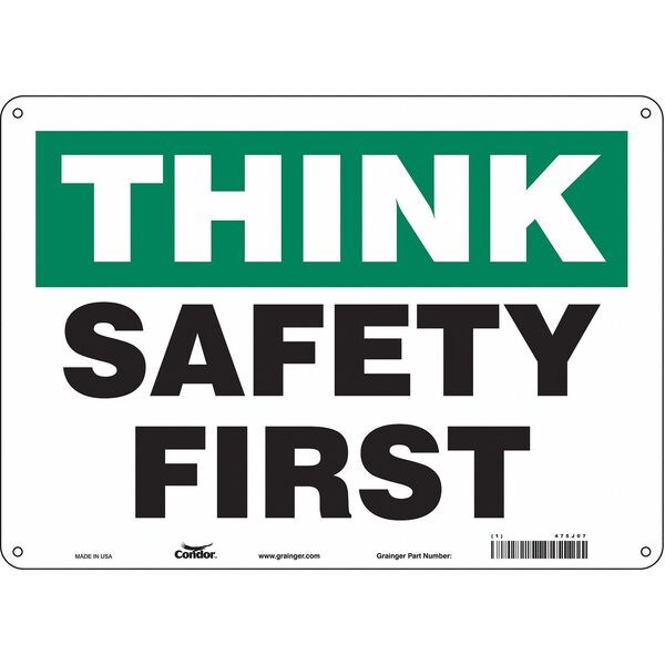 Safety Sign, Horizontal Rectangle, Number of Printed Sides 1, English, Sign Format Other Format, Sign Legend Safety First, Sign Legend Background Color Green, White, Sign Legend Style Text