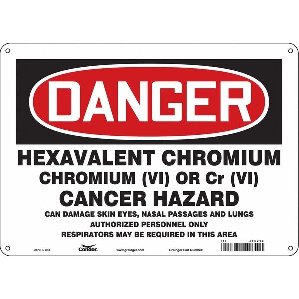 Safety Sign, Horizontal Rectangle, Number of Printed Sides 1, English, Sign Format Traditional OSHA, Sign Legend Hexavalent Chromium Chromium (Vi) Or Cr (Vi) Cancer Hazard Can Damage Skin, Eyes, Nasal Passages And Lungs. Authorized Personnel Only. Respirators May Be Required In This Area., Sign Legend Background Color White, Sign Legend Style Text